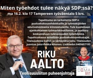 Oletko kiinnostunut työntekijöiden edunvalvonnasta? Tai kenties ehdokkaana SDP:n puoluekokousedustajavaalissa? Olet lämpimästi tervetullut maanantaina 16.2. klo 17 Tampereen työväentalolle. Tilaisuuden aiheena on työmarkkinat, hallituksen työelämäleikkaukset ja
