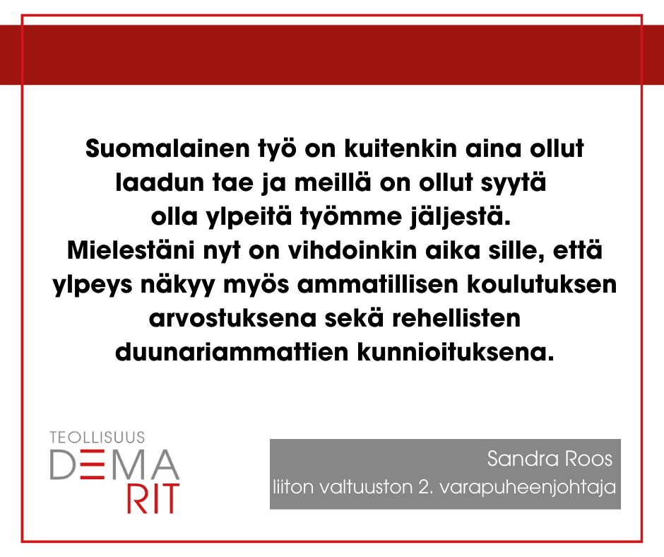 Työnantajajärjestöt tekevät omien tavoitteidensa eteen kaikkensa. Meidän tehtävämme on huolehtia siitä, että työntekijät ymmärtävät oman voimansa. Äänestämällä vaikutamme siihen, millaisia päätöksiä tehdään työelämän, sosiaaliturvan ja järjestäytymisoikeuden tulevaisuudesta. Jokainen ääni teollisuusdemarille on samalla ääni reilummalle Suomelle.